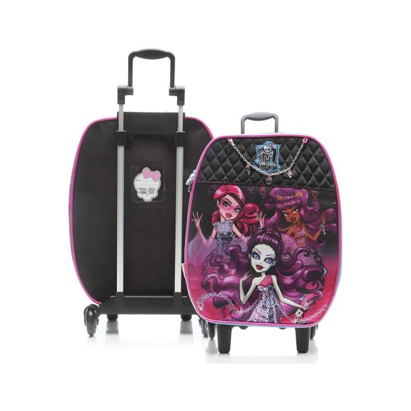 A malinha de rodinhas G Monster High é produzida em poliéster e cetim / Carrinho em alumínio com alça articulada em polipropileno / Internamente conta com um ótimo espaço, capaz de armazenar cadernos universitários, livros, apostilas e estojos escolares / Possui separador de material em velcro / Vem com uma linda pulseira que pode ser presa na frente da malinha / Possui identificador no verso.