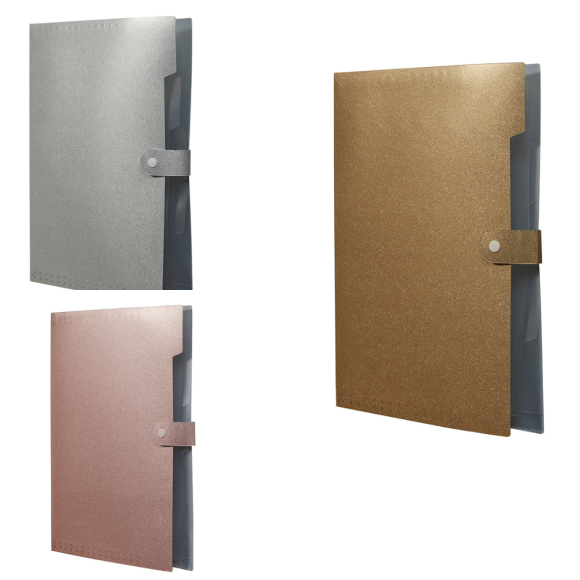 Detalhes: Pasta sanfonada A4 Glitter / Cores: Rose, Prata e Dourado / Compartimento: 5 divisórias / Item incluso: cartela de etiquetas / Medidas: 238mm x 330mm / Fechamento em botão.