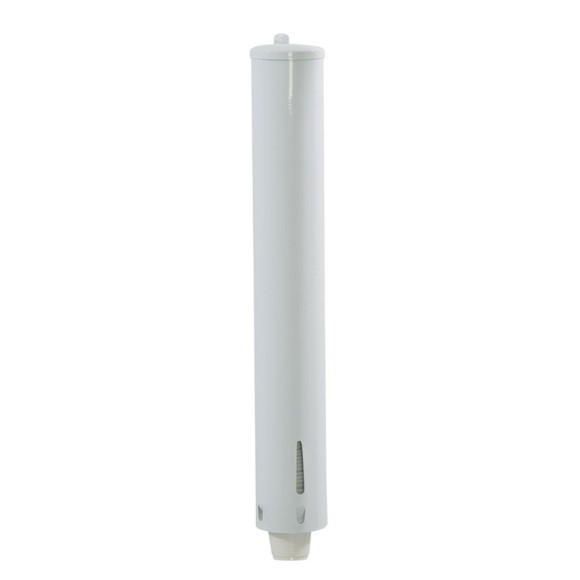 Tubo e Tampa Confeccionado em Aço-Carbono e Acabamento em Pintura Eletrostática Branca / Possui Abas Para Fixação na Parede / Acompanha Kit Contendo Buchas e Parafusos / Possui Visor Frontal Para Controle da Reposição dos Copos no Suporte / Medidas: (AxD) 450mm x 75mm