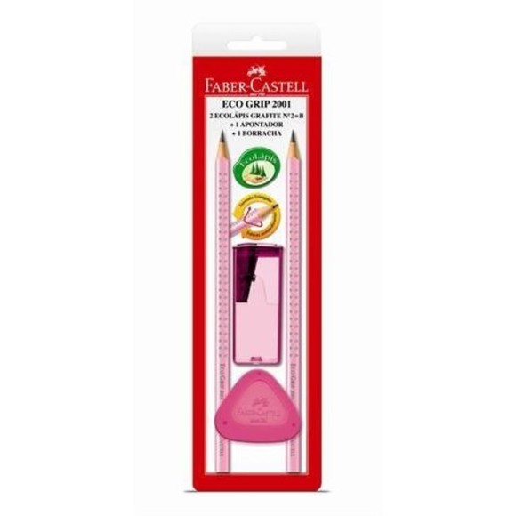 Especificação: Kit Ecolápis Grip da Faber-Castell / Kit contém: 2 Ecolápis Grafite, 1 Apontador com Depósito e 1 Borracha / Lápis: Formato triangular ergonômico / Apontador: 1 Furo com depósito / Graduação: Nº 2=B