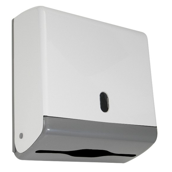Toalheiro junior em ABS para papel interfolha 2 ou 3 dobras / Injetado em plástico ABS branco, visor cristal transparente para controle de reposição do papel e fundo cinza / O sistema de fechamento é feito através de fechadura em plástico ABS, que mantém o produto trancado / Acompanha chave plástica e kit contendo buchas e parafusos para fixação na parede / Capacidade: 600 folhas aproximadamente / Medidas: 285mm (altura) x 255mm (largura) x 120mm (profundidade).